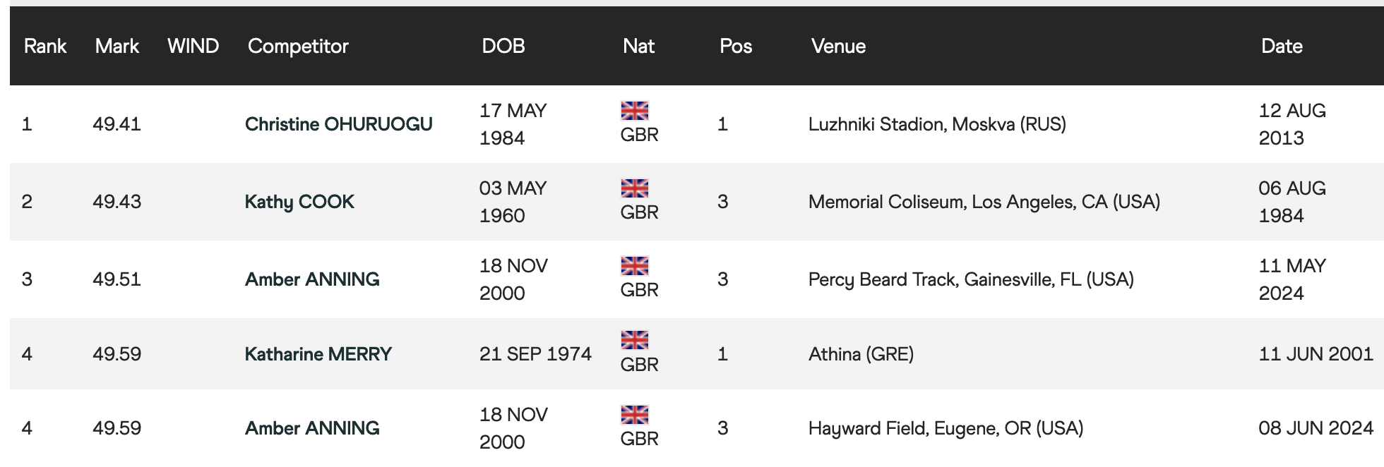 Amber has now run 49 seconds three times this season, making her the only woman to feature twice in the GB All-time top five fastest times ever recorded.