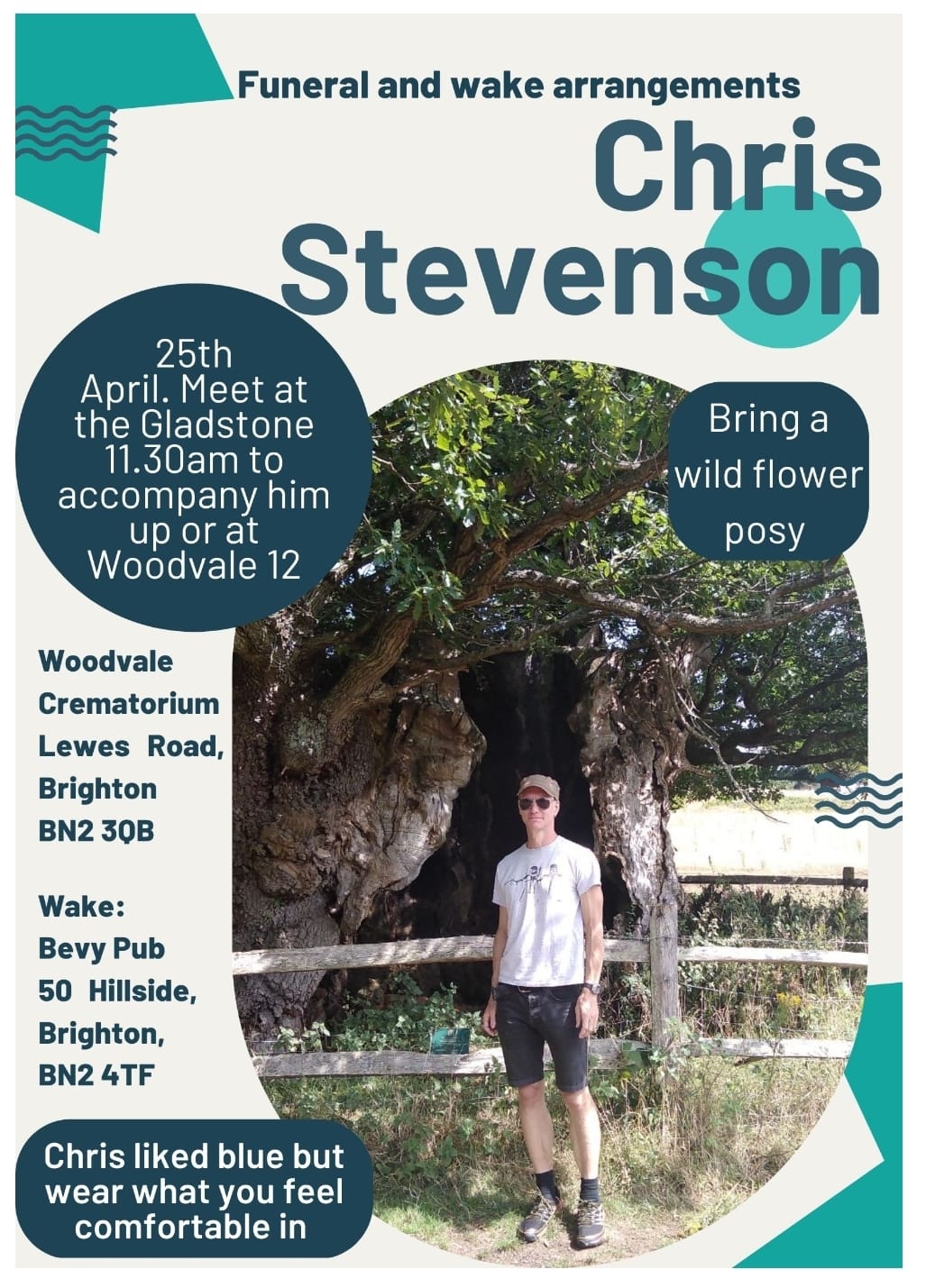 Wear something blue – Chris’s favourite colour – or anything you feel comfortable in. NO FLOWERS, but please bring a wildflower posy.