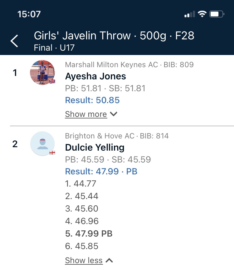 Meanwhile, in the same age group, there was a superb silver medal for Dulcie Yelling in the javelin, with a 2.5 metre personal best of 47.99m. Dulcie beat her previous PB of 45.59m in four out of her six throws. It was the culmination of a fabulous season in which she won English Schools and Schools International (SIAB) titles.